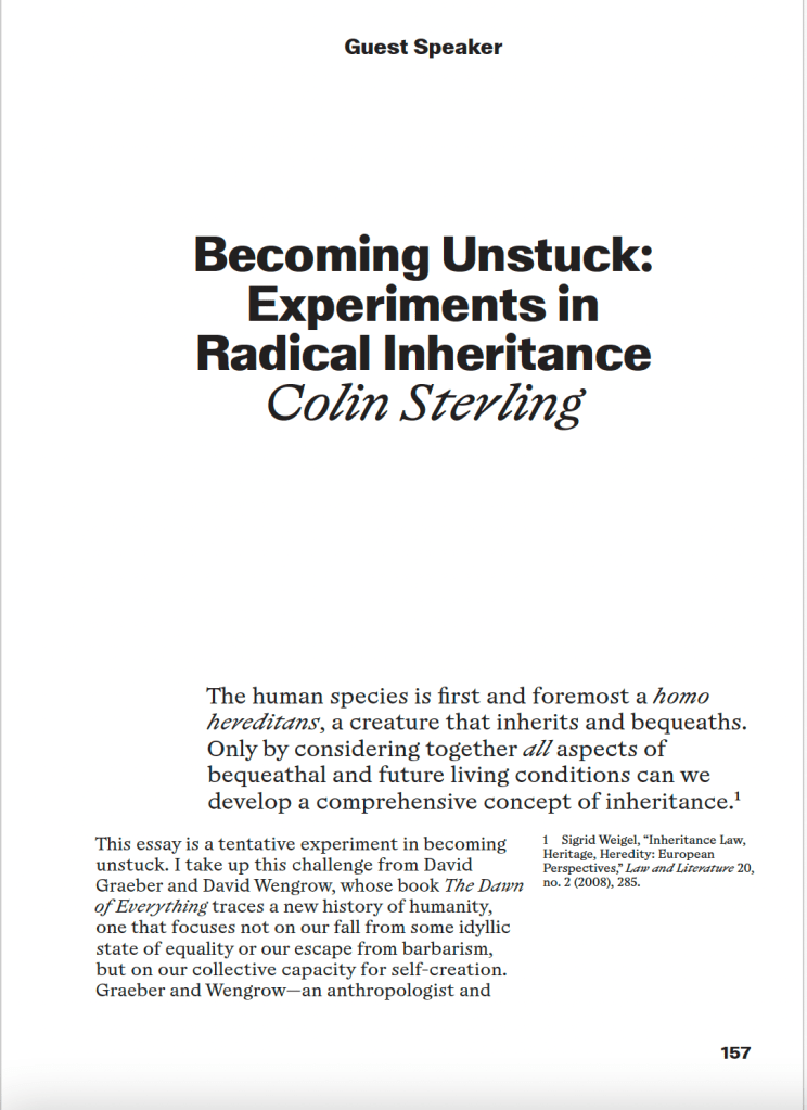Sterling, Colin. 2023. Becoming Unstuck: Experiments in Radical Inheritance. In: C. Rouleau (ed.) Experimental Re(é)[flex|ct|ion] Expérimentale. Luxembourg: Casino Luxembourg, 157-168