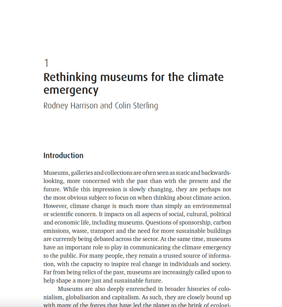 Harrison, R. & Sterling, C. 2023. Rethinking Museums for the Climate Emergency. In: R. Harrison, N. Dias & K. Kristiansen (eds.) Critical Heritage Studies and the Futures of Europe. London: UCL Press, 15-32