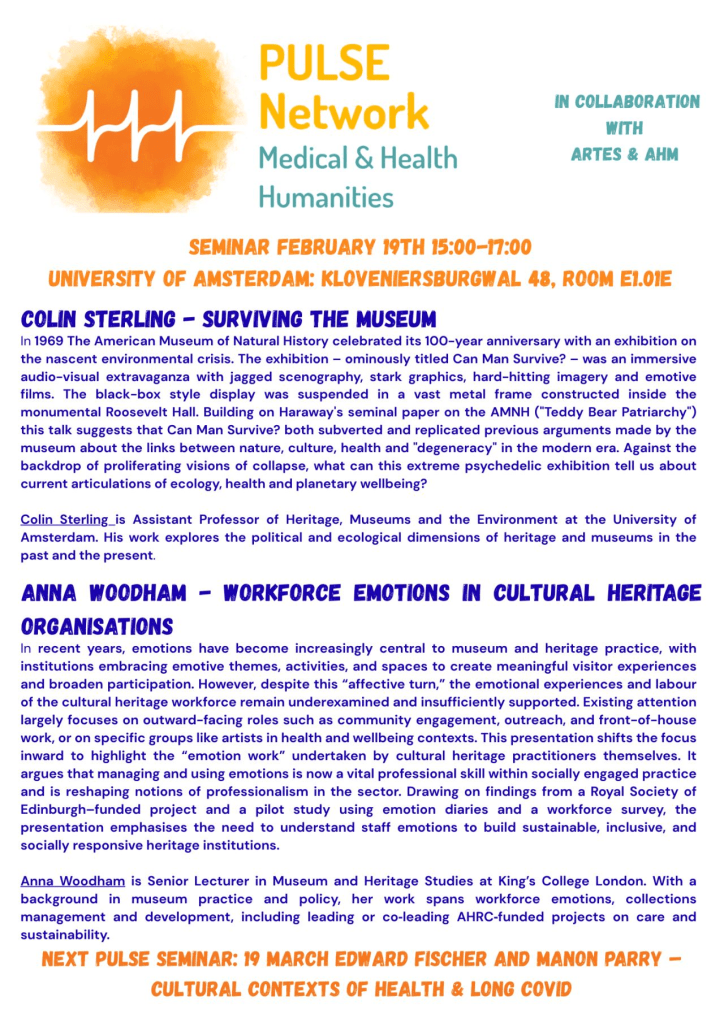 Surviving the Museum Colin SterlingJanuary 29, 2026January 29, 2026Environmental Museology, Talks & Events Post navigation PreviousNext Invited talk for the PULSE Network in Medical and Health Humanities Thursday 19 Feb, 15.00, Bushuis Related
